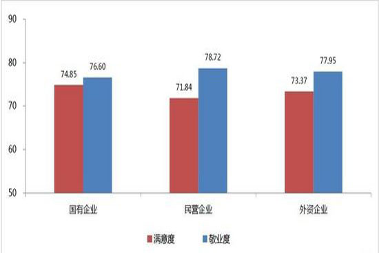 外資企業(yè)員工的滿意度與敬業(yè)度介乎國(guó)企與外企之間,同時(shí)發(fā)現(xiàn)國(guó)企存在的問(wèn)題是,其員工滿意度水平較高但敬業(yè)度水平有待改進(jìn)。
