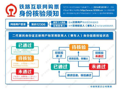 據(jù)介紹,實(shí)施身份信息核驗(yàn)后,在12306網(wǎng)站上使用二代居民身份證的注冊用戶和常用聯(lián)系人身份信息將有“已通過”、“待核驗(yàn)”、“未通過”三種核驗(yàn)狀態(tài),使用護(hù)照、港澳居民來往內(nèi)地通行證、臺(tái)灣居民來往大陸通行證的注冊用戶和常用聯(lián)系人身份信息將有“已通過”、“請報(bào)驗(yàn)”、“預(yù)通過”、“未通過”四種核驗(yàn)狀態(tài)。